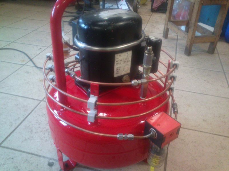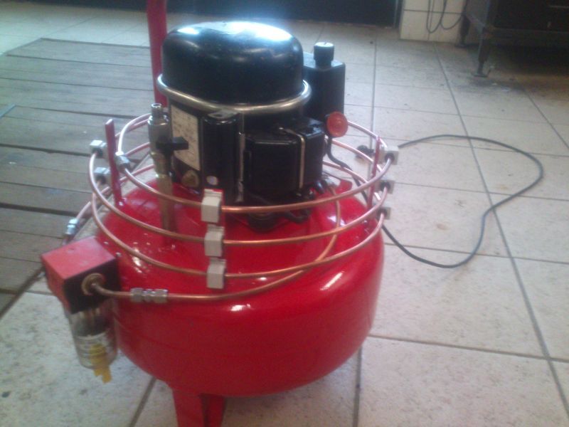 Felteszek pár képet az elkészült kis hűtőgép kompresszoromról. Ami extra,hogy levegő visszahűtőt tettem rá és olaj-víz leválasztót,így a tartályba mindig tiszta,hideg levegő megy.