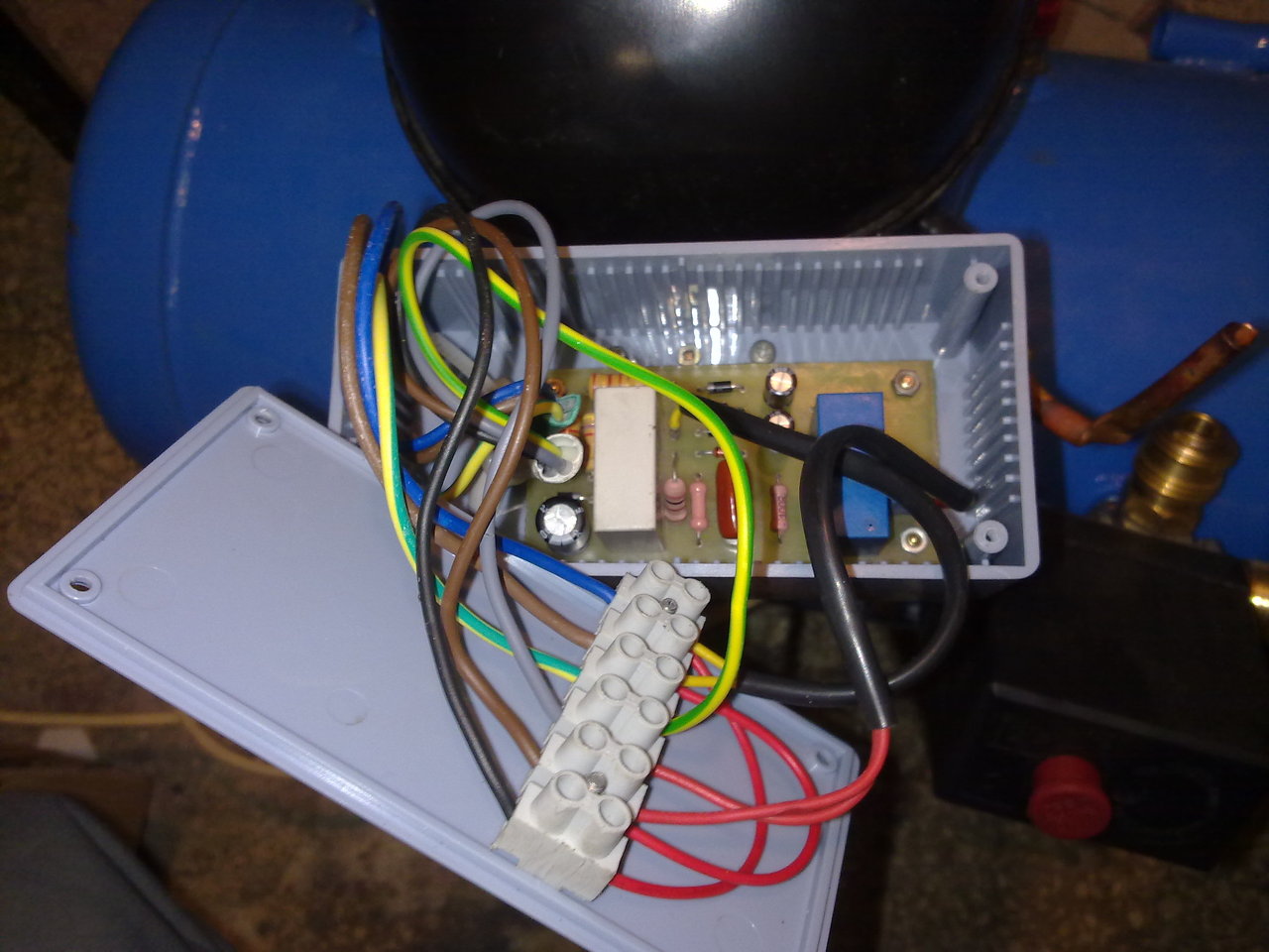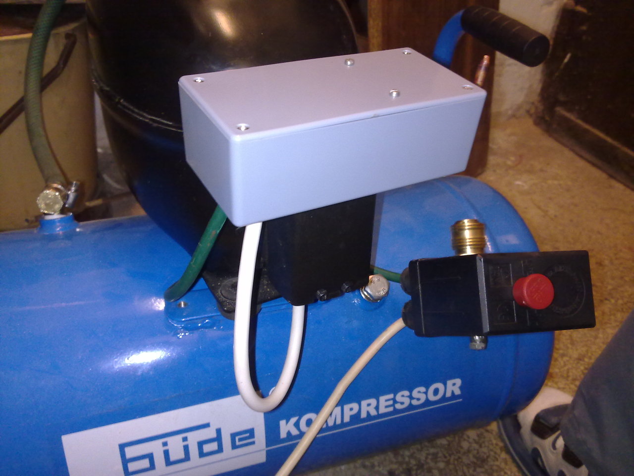 Múltévben kilyukadt a hűtő szekrényünk, és az abból megmaradt motorból és a raktárban fellelt GÜDE kompresszor tartályból csináltam egy kompresszort. Nem volt semmi meló, de a végén csak összeállt a kép. Valahol sajnos még ereszt, mert másnapra mindig lemegy a nyomás 1bár alá a 7,5-ről. Ma végül is gyakorlatilag teljesen elkészült, a tartály kapott kerekeket, a motor segédfázis kapcsoló áramköre pedig bedobozolódott. Néhány kép lent.