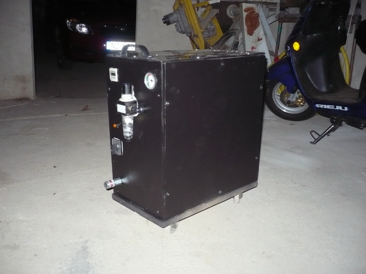 A tartály olyan 50l körül lehet, teherautó légtartály, így van rajta elég csatlakozási lehetőség("alul" - kondenzvíz leeresztőnek és a két végén). Van még egy állvány is, ehhez pánttal rögzíteném a tartályt, mivel nem merném hegeszteni.