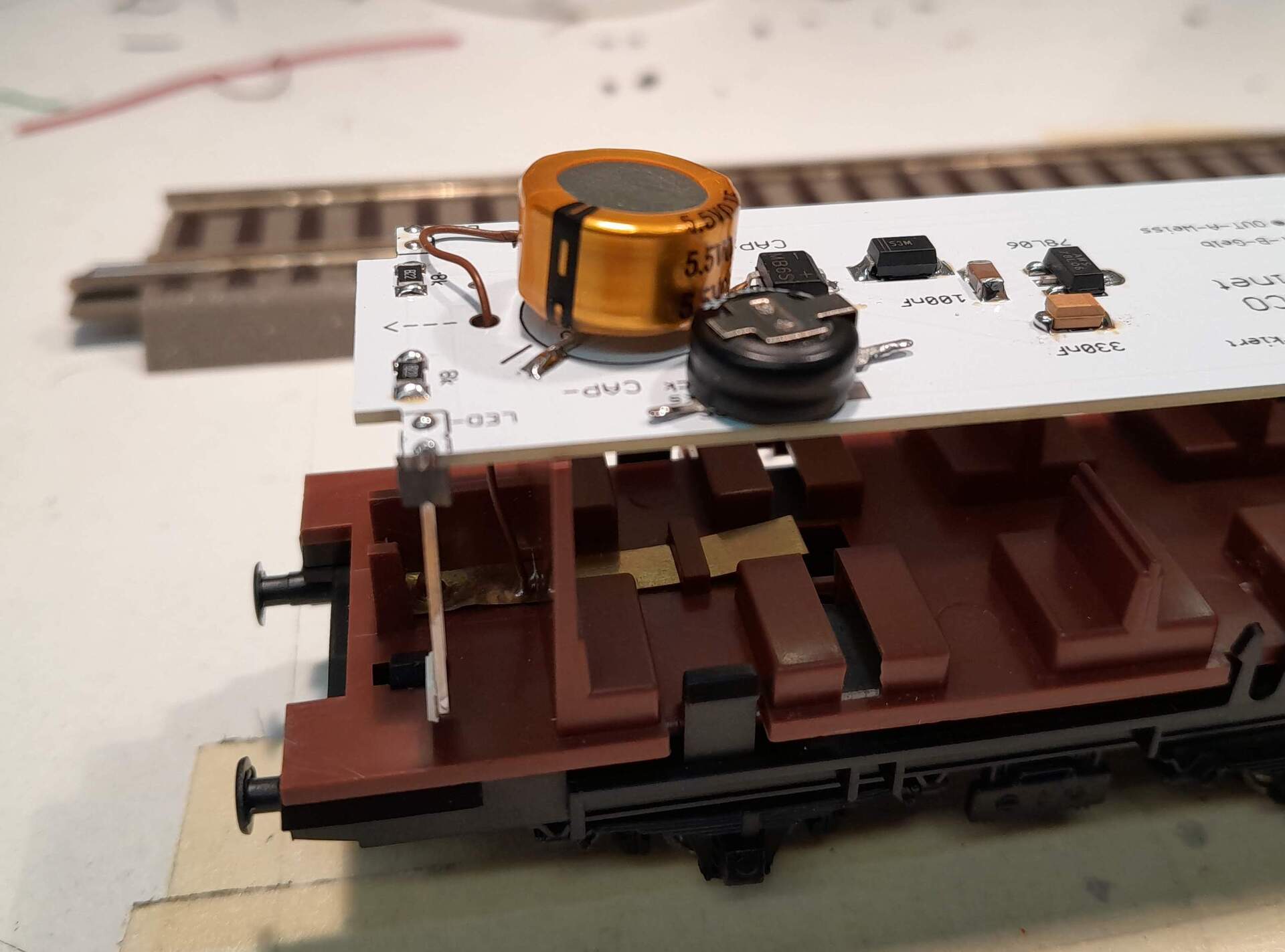 "A stepDown és stepUp áramkör nagyon nehezen fér el" Nincs igazad. Többen is gyártanak ilyen áramkört, én is készítettem. Kb egy kis dekóder méretűek. Valóban a tekercs a legnagyobb benne. Ez itt az enyém. Mellette egy gyári mozdonydekóder. Jóval kisebb mint 6 szupercap.