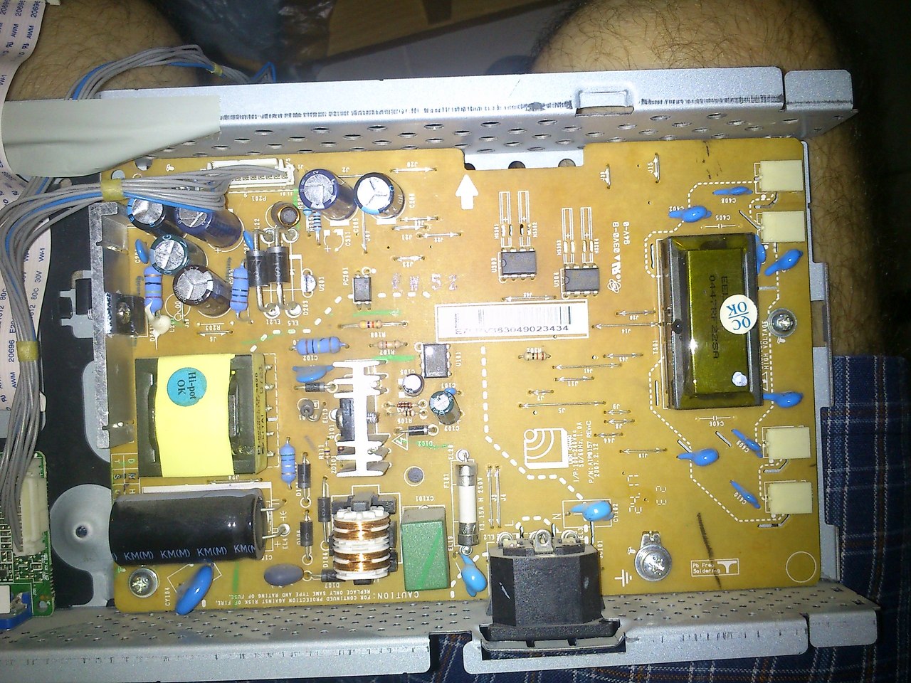Nem biztos hogy a tápegységben kell a hibát keresni,mert nem látszik rajta semmi rendellenes bár ezt azért nem kell készpénznek venni.Azok a fehér megfolyások pedig valamilyen szilikon,szerintem szigetelés céljából van ott.