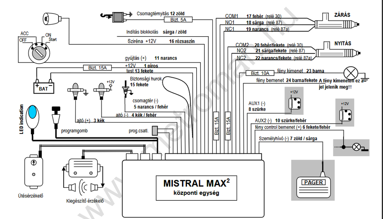 Először is tisztázzuk,mi a feladat? Működik a gyári kp.zár és szeretnéd távirányítós vezérlővel vezérelni,vagy valami hiba van a gyári renszerben,és szeretnéd kiváltani? Mielőtt nekiállsz,ellenőrizd a 3.ajtó gumi átvezetőben a vezetékeket,típus hiba hogy eltörnek. Ha vezérelni szeretnéd: Gyári csatlakozó: A barna-piros és barna-fehér a két negatívos vezérlés. Vastag barna:test Vastag piros:+ A fekete alapúak a motor vezetékek(nyit,zár,retesz),ne köss ide semmit. Vezérlő Zöld:negatív kimenet ablakhúzó modulhoz vagy gyári komfort záráshoz zárásra kb. 30s-ig aktív.N.C. Kék:negatív csomagtartó nyitó impulzus(Opelben nyit-zár motor van a csomagtartón)N.C. Barna:irányjelző (autóban fekete-zöld) Barna:irányjelző (autóban fekete-fehér) ellenőrizni! Fekete:test gyári csati vastag barna Piros:+tápfesz.gyári csati vastag piros. (Ha nincs a kötegen biztosíték,tegyél mindenképp!) Vezérlés: Sárga és sárga-fekete:test Fehér: záró Fehér-fekete:nyitó vezeték,(amelyeket az izzós próbalámpán keresztül meg tudsz vezérelni.) (Gyári csatlakozóban a barna-piros és barna-fehér ) Ha fordítva vezérel,csak cseréld meg a fehér és fehér-feketét. Fehér:gyújtás Szerintem ne kösd be. Automatikusan zár gyújtás után...és ha elfelejted,és jeget kaparsz? Saját felelősségre kösd be. És nehogy összekeverd a vezérlés sorban levő fehérrel! És persze minden pontot ellenőrizz,kicsit fáradt vagyok. Idézet: „ellenőrizd a 3.ajtó gumi átvezetőben a vezetékeket” 3. Értsd harmadik(csomagtartó.)
