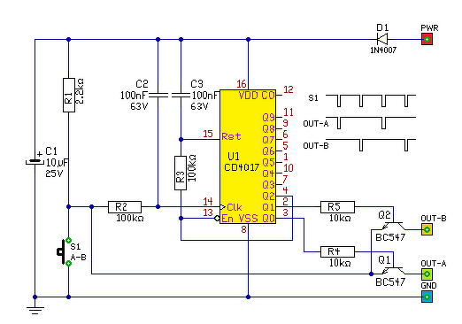 Gondolkoztam az áttervezésen. Lehet egyszerűbben is meg lehet valósítani. Lekötöm az 5 vezetékes első ajtó motorját. A gyári központizár vezérlőt kiegészítem a képen látható léptető ic-vel, hogy minden második gombnyomásra dolgoztassa meg a 3 db többi motort, záráskor a reset lábra kötöm a relét meghúzó impulzust, így alaphelyzetbe állítom a következő nyitásig. Az első ajtó 5 vezetékes motorját bekötöm egy ugyanolyan monostabil központizár vezérlő duplareléves dobozzal, ami a gyárival megegyezik. Mivel az első motor 5 vezetékes, így az ha a második gombnyomásra is kap negatív impulzust, nem fog zavart kelteni, hiszen a mikrokapcsolója felső állásba kerül, ergo nem fog nyitni. Jó az ötlet?