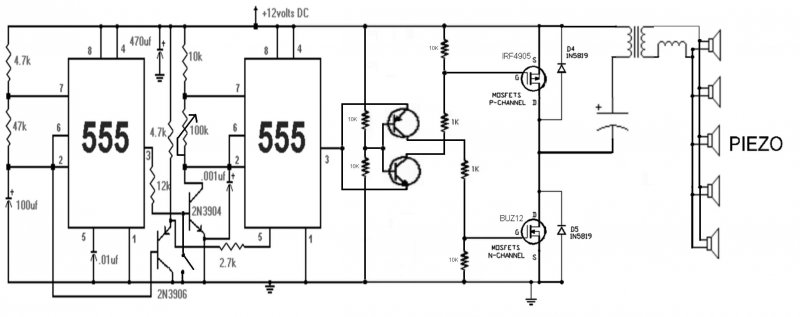 Ez tulajdonképp egy összeollózott kapcsolási rajz. Az első rész egy ultrahangos szirénából áll. Ezt egy normál sziréna kapcsolásból a rezgő kondenzátor 10-ed részére csökkentésével kaptam. Így 1 kHz helyett 10kHz körül rezeg. Ez egy olyan speciális sziréna kapcsolás, amelyik csak az emelkedő résznél szól. Így félperiódus csend után félperiódus emelkedés van. Ezzel 50%-ra csökkenthető a fogyasztás, és szerintem elég nehezen szokik hozzá a kutya a szünetek miatt. Ezt követi egy fázisfordító, erre ültettem rá a már megtárgyalt FET-s végfokot, amely a PWM motorvezérlési alapelvek szerint működik. És a végén LC körben a piezók. Hát ez lenne a tervem, amit a felvázolt elvek alapján hoztam ki. Ehhez elvileg 3 Li-ion aksi elég, mert 4-gyel túlfeszültséget kapna a 555-ös IC. Ha 50 W-t várok, akkor legalább 4A-es fogyasztásnak kell lennie. Egy 1000mAh akksi esetén ez 1/4 óra működést biztosít. A félperiódus kihagyása miatt vagy 1/2 óráig működik, vagy emelhetjük a teljesítményt további piezók bevonásával. Ha a .001uf kondenzátorhoz egy kapcsolót építünk be, akkor választhatunk folytonos sziréna és emelkedő hangú sziréna között.