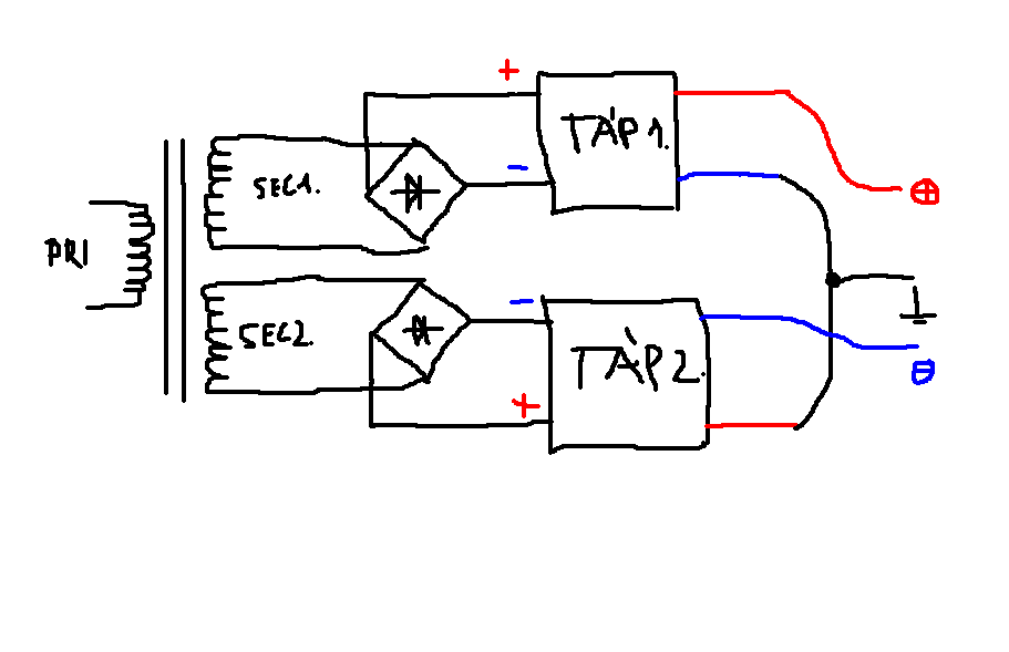 De mondjuk párhuzamosíthatod is a szekundereket, egy nagy diódahíd és a két táp egyről menne. Bár a két szekunderes jobb megoldás.