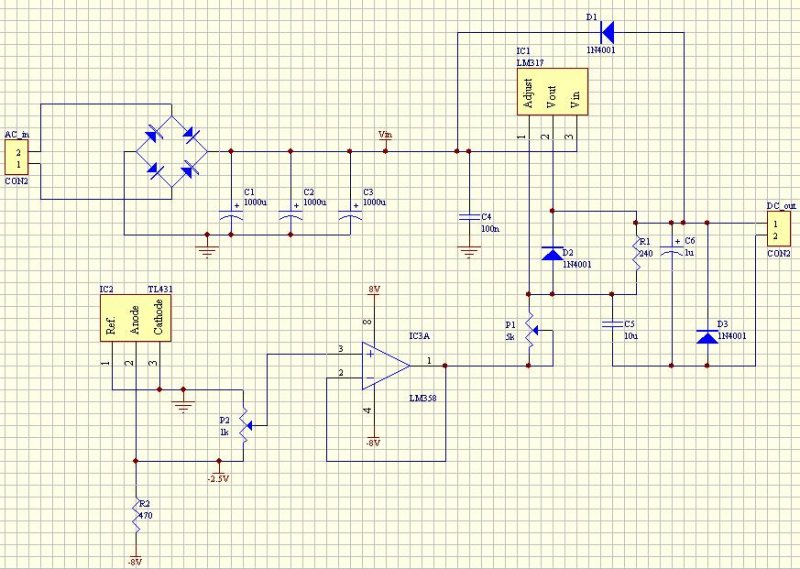 Itt az én elgondolásom, ahogy ígértem. Az első képen látod az adatlapban szereplő ajánlást. Ennek a jobb oldalát ( tehát az eredetiből kimaradt az áramkorlátozó rész ) látod az én rajzomon. Annyit változtattam rajta, hogy a negatív tápot kicsit bonyibban állítja elő: először egy 7808 "megfogja" a bejövőt és abból egy 7660 "csinál" negatív feszültséget. ( A 7808 azért kell, mert a 7660 10V-nál többet nem visel el. ) Ez után egy TL431 előállít -2.5V-ot. Ebből a -2.5V- ból a P2 által beállított feszültséggel a műv. erősítő "lehúzza" az LM317 referencia lábát.