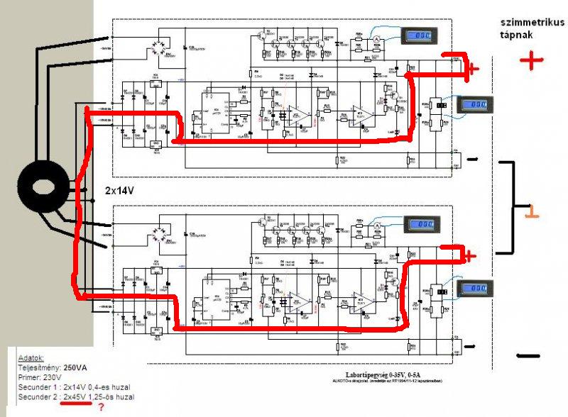 Sziasztok! Szeretnék egy labortápot, de rögtön szimmetrikusat. A tapasztalatom a labortápok témaában =0. Sokat visszaolvasva szeretném az RT-s áramkört Alkotó-féle nyákkal megépíteni. Ez a projekt nem ma lesz kész, de már tervezgetem és gyűjtöm a "hozzávalókat". Készítettem egy sematikus ábrát ami szerintem működőképes, de kérlek nézzétek meg hogy a gyakorlatba is átültethető-e. Egy ilyen: