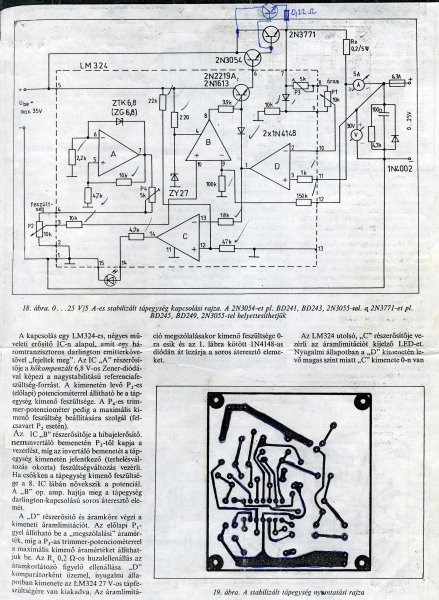 Ha a D kapu "túláramot" érzékel akkor a kimeneti áteresztő tranzisztorokat is el kezdi lezárni. S mivel a D kapu komparátoros üzemben dolgozik, ezért a tranzisztorokat szinte teljesen ki is kapcsolja. Persze ekkor a túlterhelés is megszűnik, ezért gyorsan vissza is kapcsolja a kimenetet. Vagyis oszcillál a kimenet, amit csak a kimenetre kötött 100nF-os kondenzátor csillapít. Persze az oszcillálás velejárója, hogy a túlterhelést jelző LED is jelezni fog. A kimenet egy bizonytalan állapotú "állandó" kimeneti feszültségre is beállhat amit a B hibajel erősítővel szabályozni is lehet. ( Elvileg. Ezt a kis eszmefuttatást csak oszcilloszkóppal lehet ellenőrizni. ) Vagyis a D kapu környékén kellene először a hibát keresni. PL az áteresztő tranzisztorok vezérlésére kapcsolódó diódát kellene kiforrasztani. Így a túláramvédelem már könnyebben ellenőrizhető a megfelelő feszültségszintekkel. A kimenet és a test közé egy potenciométert kell kötni, s a potenciométer csúszkájáról a feszültséget a 11-es pontra kell adni. A 10 és 11 pont feszültfégei alapján a D komparátor kimenetén vagy közel tápfeszültség ( LM324 tápfeszültsége = 27V), vagy közel 0V -ot kell mérni. S természetesen a kontroll lednek is jeleznie kell az aktuális állapotot. A C kapu állapotait most nem részletezném, mert pontosan leírja a cikk.