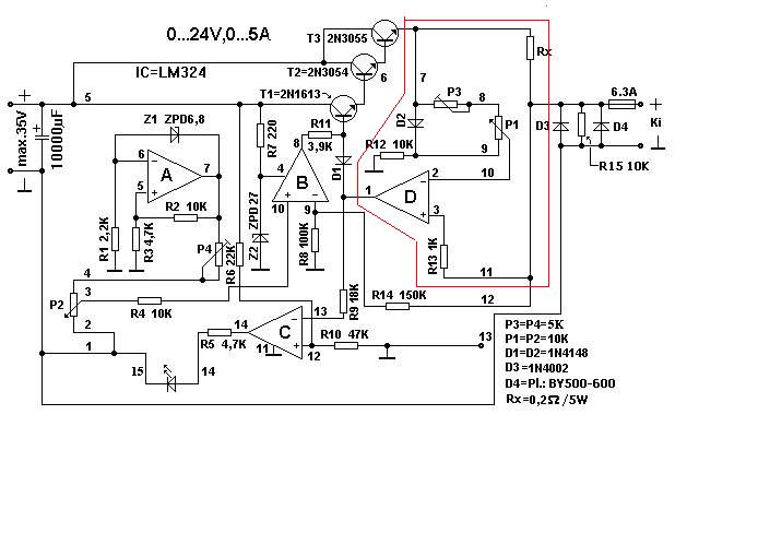 LM324. 2.lábán beállítasz egy feszültséget. Ha a 3.lábán kisebb feszültség lesz, akkor veszi el, a tranzisztorok elöl a feszültséget. Nézd meg hogy a 1. láb elmegy e a negatív irányba. igen / nem? Ha nem, el kell érni, hogy a 3. lábon kisseb legyen, a feszültség, mint a 2 lábon. Ha igen a bemenet jó ( 2.,3. láb ). Akkor a D1 és R11 ellenállást kell nézni. Ha a D1 jó, akkor a R11 növelni, mind addig amíg a tranzisztor hajlandó nyitni, áram generátor nélkül. ( 1 láb + tápon. A +táp a 4 láb ) Mivel a D erősítőn, nincs visszacsatolás, billeni kell. (határozott a váltás +/- táp)