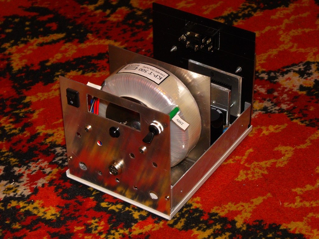 A fényképek nem a végleges állapotot mutatják. Egyrészt a labortáp áramkör maga sem végleges (de a következő panelterv már az lesz), az előlap sincs kész és hiányoznak belőle a potik, banánhüvelyek, LED-ek és a panelmérő. Az áramkör két furattal hátrébb fog kerülni és a melegedő alkatrészek így pont felfeküdnek majd a B-betűvel jelölt alumínium lapra, ami pedig a műszerdoboz külsején lévő hűtőbordához kapcsolódik. Az alkatrészeken most rajta lévő 5mm vastag alumínium lap csak a tesztelés erejéig van rajta. Végül a toroidot tartó idom felső részére két kis áramkör fog kerülni, egy elektronikus lágyindító az 500VA-es toroidnak és egy kisebb rém egyszerű tápegység.