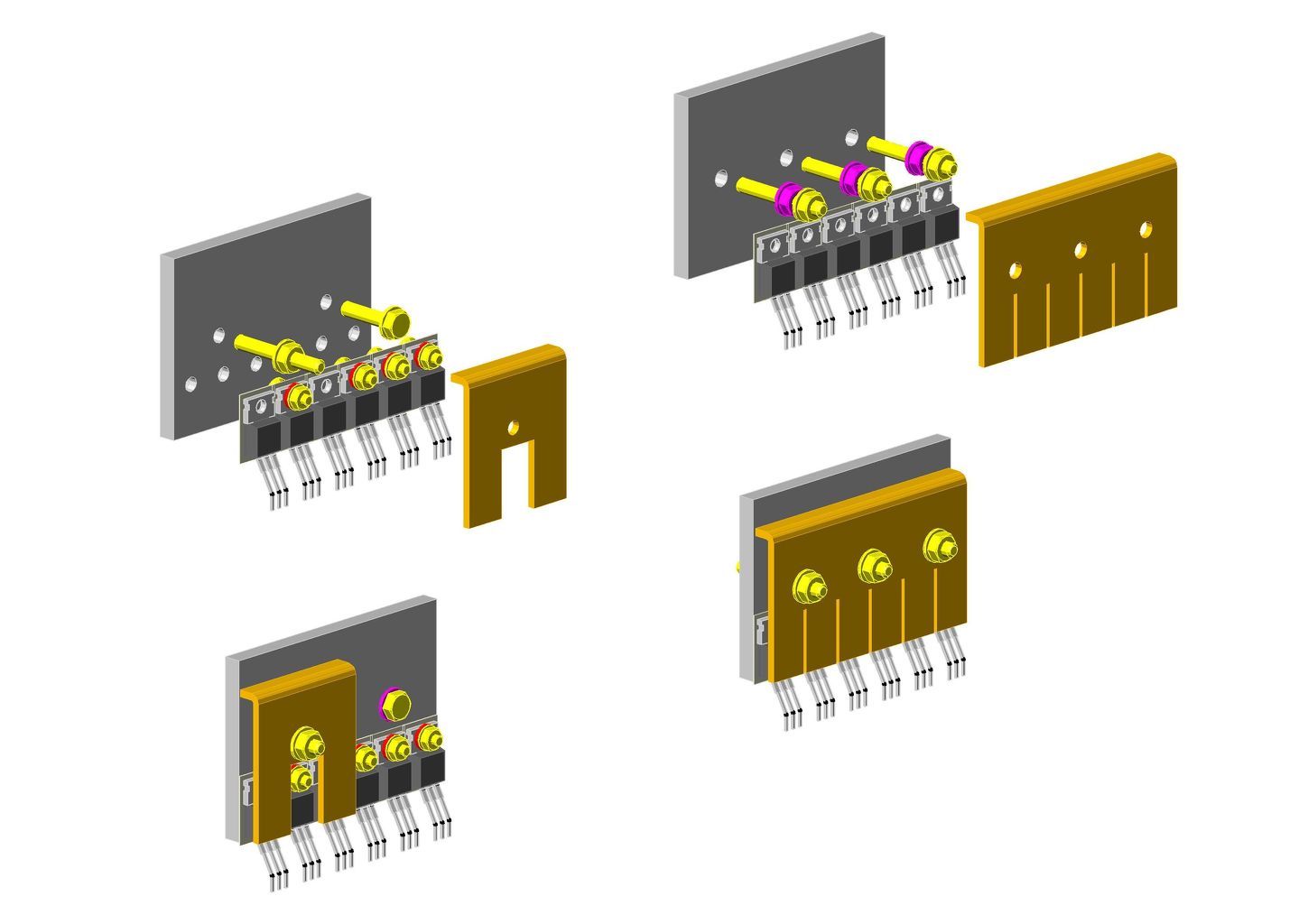 A két megoldást egymás mellé rajzoltam, és a szerelt egységek fölé, azok szétszedett változatait is oda tettem, ami jól szemlélteti a tényleges felépítést. Csatoltam egy elől, és egy hátulnézetet is. Az egyiken csak a két melegedő alkatrésznek van külső leszorítója, és az eredeti alulemezhez minden változtatása nélkül alkalmazható. A másikon az összes tokozást egyetlen lemez-pánt fogja le. Ide ha akarjuk használhatunk egyedi hőközlő lemezt, de akár közvetlen a borda sík felületére is felfoghatjuk a hűtendő elemeket. A csavarok meglazításával a teljes bordaegység leemelhető. A rögzítő csavarok javasolt mérete M4, és a hatlapfejű kialakítás jól kezelhető a szűk hely ellenére. A leszorító laphoz 2mm-es rozsdamentes lemezt javaslok, mert ez már kellően merev, és az alaprugalmassága képes tolerálni a TO220-as tokozások magasságszóródását. A hozzászólás módosítva: Jan 7, 2014