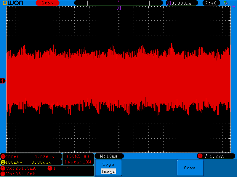Hogy tisztába tegyük a dolgokat, levettem az SMPS II tápom a polcról, megszakítottam a főtáp szekunder-tekercsét ami megy a nyákra és közbeiktattam az Isabellenhütte söntömet. A szkópot pedig ráakasztottam a sönt érzékelő lábaira. A mellékelt jelalakokat tapasztaltam kb 480W terhelés mellett. Őszintén szólva ezt nem teljesen értem, de ez a jel van a söntön. Este hatig vagyok a melóhelyen, addig töröm rajta a fejemet hogy ez most mi a bánat, és addig várom az ötleteket. Addig nem szedem szét a mérési összeállítást.