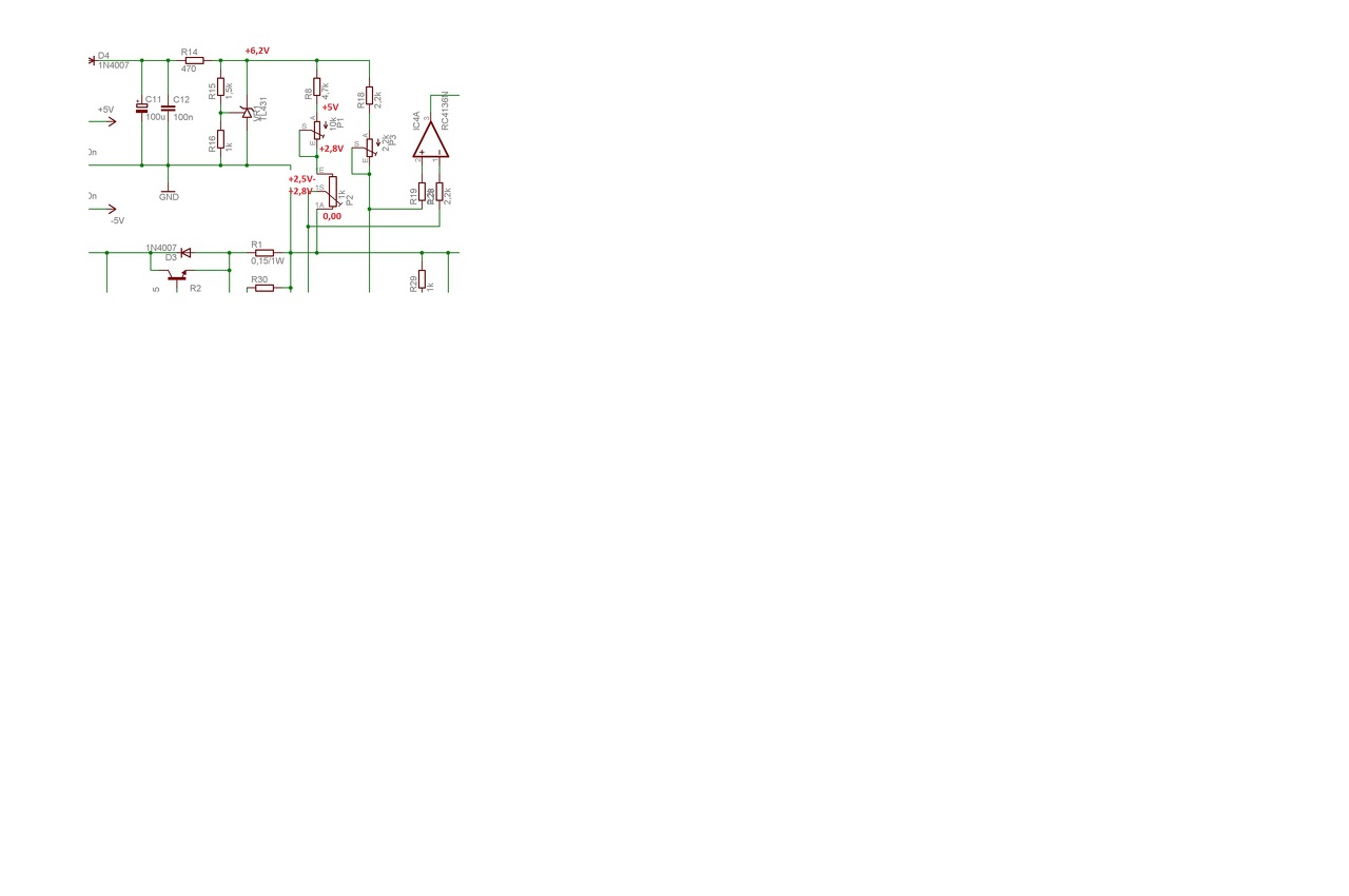 - Azt jól írod, hogy a mérések alappontja a táp pozitív kimeneti pontja. Vagy is a GND. - De a TL431 katódján nem mérhetnél negatív feszültséget. Mint ahogy a +-5V-nak sem mérhetnél +5,6V és -4,4V értéket. - A TL431 katódja a GND ponton van! Így nem mérhetsz rajta -1,8V feszültséget.. - A TL úgy működik, hogy mindig beállítja az R16 ellenálláson a kb. 2,47V feszültséget. (Feltéve, hogy a C11-en a tápfesz elegendő, R14 nem nagy és nincs a referencia fesz túlterhelve.) Mivel R15-ön ugyan akkora áram folyik át, mint R16 ellenálláson, R15 feszültségét is az határozza meg. IR16=2,47V/R16=2,47V/1k=2,47mA. UR15=IR16*R15=(2,47mA*1,5k)=3,7V. A referencia feszültsége a TL katódján a kettő összege. Uref=2,47V+3,7V=6,17V. - Ez a kiindulási alap. És innen kellene mérni a továbbiakban.