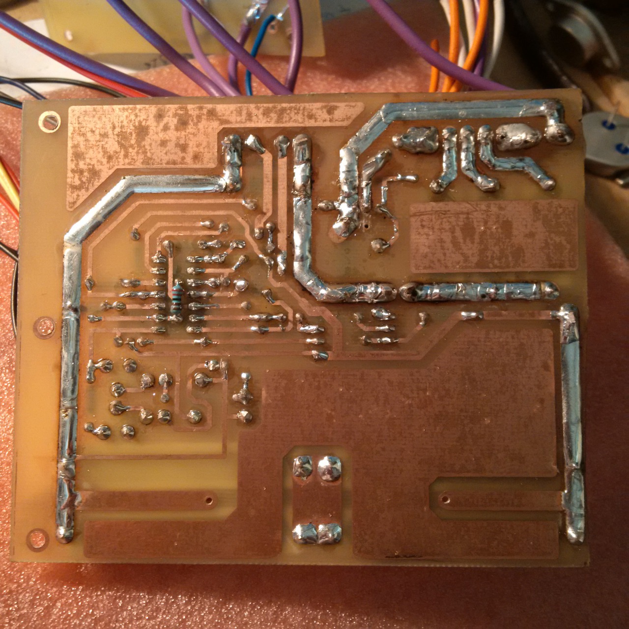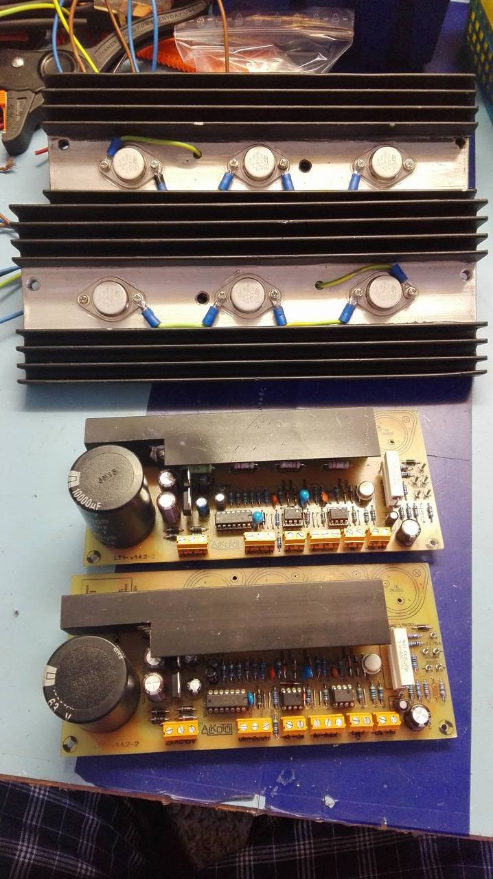 A képeken már annyi módosulás látszik, hogy próbálgattam több alkatrészértékkel a meghajtó BD244 tájékán, de ezek a változtatások sem váltak be. (az előző és következő verzióból pl R4 cseréje 39K-ra, R35 100R elhagyása, ezzel jött a vezetősáv egy darabja is ez látszik a képen). Plusz vezetékek vannak beforrasztva, de azok még üresek, a további 3db 2n3055-nek. A lazább vezetékek töve melegragasztóval oda van ragasztva, hogy ne törjenek ki. Az IC tápfeszültségei rendben vannak. Idézet: „amikor rövidzárat produkálok a kimenetén, és tekerem feljebb az áramkorlátot, a 2N3055-k azonnal tönkremennek” Milyen beszerzésűek ezek a 2N3055-ök? Elég sok hamisítvány kereng. Érdemes lenne egy hibásat kinyitni, és megnézni a belsejét. Idézet: „természetesen nagy hűtőbordán, jól hővezetőpasztázva vannak a tranzisztorok, de idejük sincs felmelegedni” A nagy hűtőborda az lenne, amit a fenti képen látunk? A középső rész, ahová a tranzisztorok vannak szerelve, túl vékony, illetve nagyon közel van egymáshoz a három tok. A hirtelen hőterheléseket nem tudja majd a borda elnyelni/elvezetni, illetve összességében kevésnek tűnik, hacsak nem kap egy ventillátort.