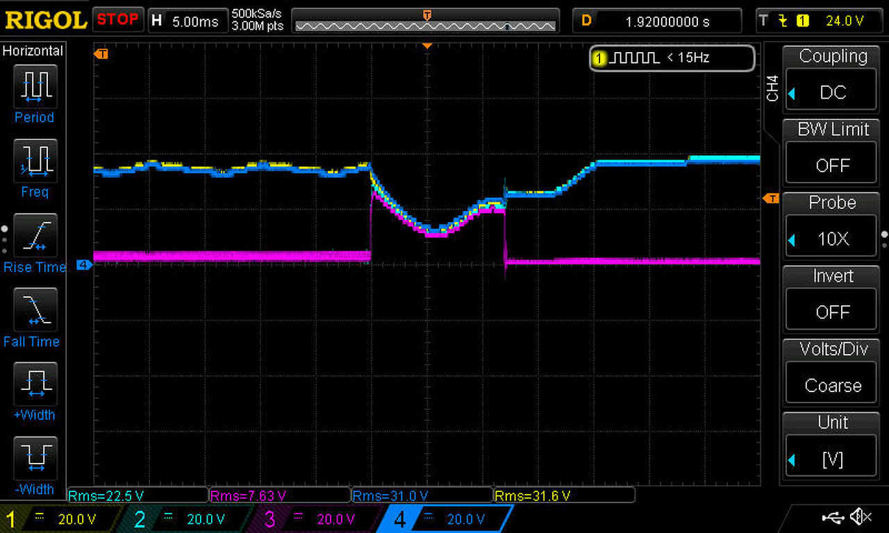 A tápegység része(graetz, puffer, -5V-os táprész külön panelen kapott helyet, de azzal nincs is probléma. Viszont akárhányszor bekapcsolom a tápegységet, a feszültséget tudom szabályozni szépen 0-35V között, viszont amikor rövidzárat produkálok a kimenetén, és tekerem feljebb az áramkorlátot, a 2N3055-k azonnal tönkremennek. A söntölést 4db 0,22ohmos ellenállással oldottam meg, hogy akár 10A -re is tudjam használni a tápot, ha még 3db tranzisztort rákötök (ez így 0,22ohm 40W). Készítettem egy képet arról a pillanatról, amikor a tranzisztorok tönkremennek, szkóppal. 1-es csat: 2n3055 kollektor 2-es csat: 2n3055 bázis 3-as csat: 2n3055 emiter 4-es csat: BD244 bázis És természetesen nagy hűtőbordán, jól hővezetőpasztázva vannak a tranzisztorok, de idejük sincs felmelegedni. Valamint felteszem a nyáktervet és a kapcsolási rajzot, ha valakinek lenne ötlete mi a hiba megköszönném A hozzászólás módosítva: Jún 10, 2017