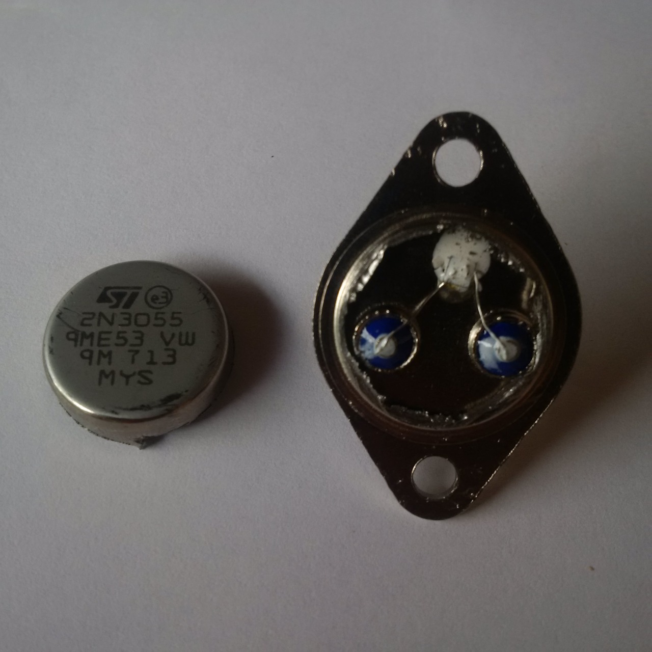 Az az "ST" jelű tranzisztor indiai hamisítvány, én a Lomexben vettem ilyet... A tok maratott felül, ezért nem fényes. A hajszálvékony emitterbevezetés jelzi, hogy ez bizony nem 3055-ös, mert azon a vékony szálon 10A nem megy át, pedig az eredeti 3055-ös tudja, mint határérték.