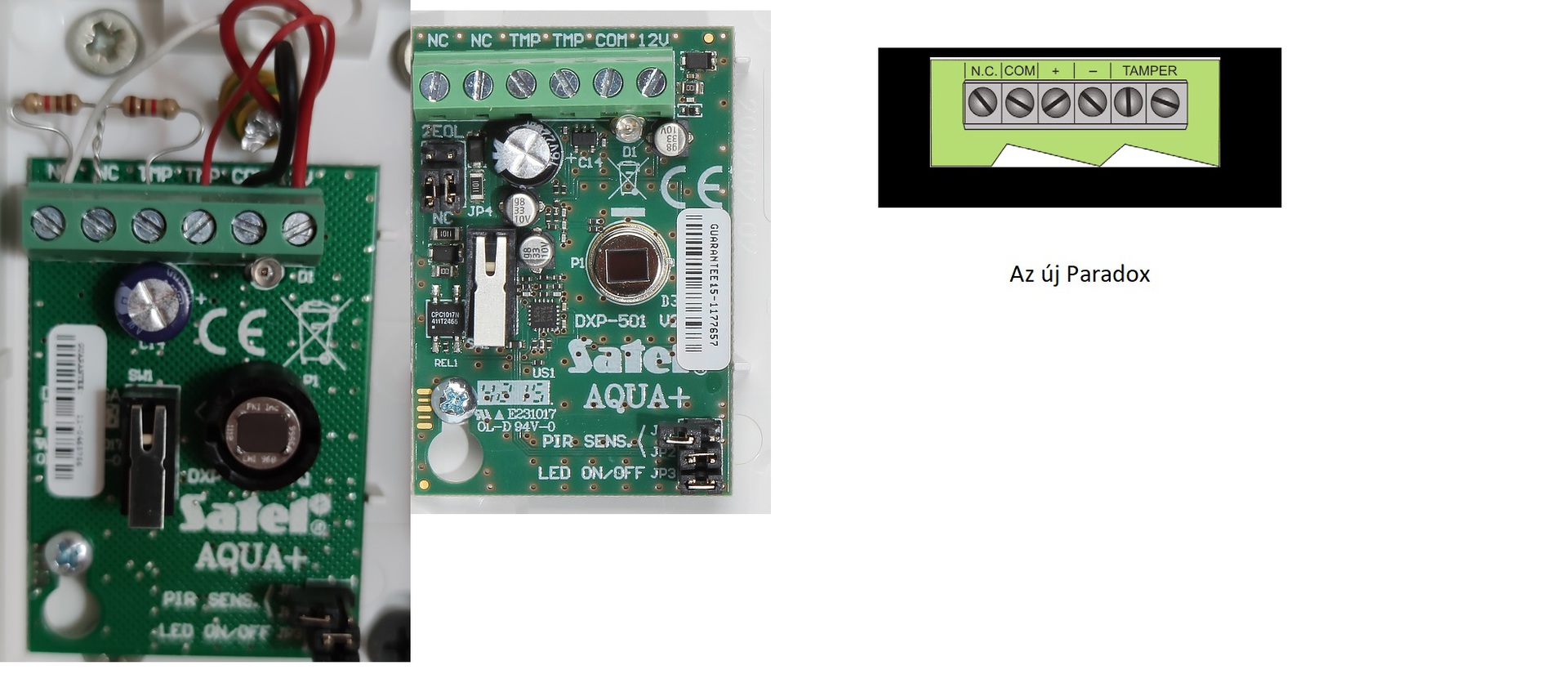 Nc normal close, normál állapotban zárt. Tehát alap esetben rövidre zárja az egyik ellenállást, így a központ csak az egyiket látja. Ha bejelez, akkor megszűnik a rövidzár, a két sorbakötött ellenállás értékét látja, tehát jelez az érzékelő. A Tamper az szabotázs kapcsoló, az is normál zárt, mikor összerakod az érzékelőt, akkor zár, így ha kinyitod, megszakítja a központ, és az ellenállások közti kapcsolatot, szabotázst jelez a központ.