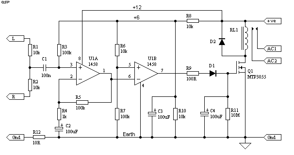 Leválasztod kondikkal a potmétert, és egyenáramot tolsz bele.Mivel a poti alsó része 0-n van és a felsőre beadnád-5-12v ot akkor egy feszültségosztóként üzemelne, közben meg a hangot is állítaná.Persze nem szabad leterhelni a potit, ez csak vezérlés lenne. Az egyenáram kimenetére meg rátenné egy tranyót, beállítanád a küszöb feszt másik potival, és tranyó meg meghuzza a relét.