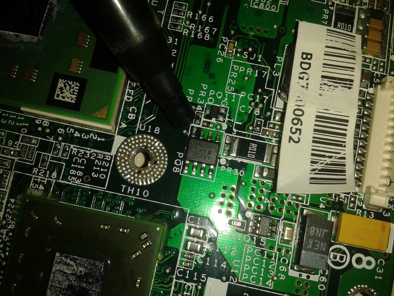 Ez érdekes. FL2 +DC táp, FL3 -DC táp. FL2 egyik vége a DC csatlakozó +-hoz megy a másik vége a PQ33 1., 2., 3., lába, így ha FL2 tekercs két végén +19.5V-ot mérsz, akkor a PQ33 1., 2., 3. lábán is azt kell mérned, ha a PCB vezetősávja nem szakadt.