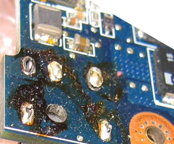 Azt a feketés cuccot denaturált szesszel lemoshatod, majd a pákáddal kell forrasztani. Arra figyelj, hogy a lehető legkisebb ideig forraszd, hogy meg ne égjen, fel ne jöjjön a NyÁK fólia. Az ESD védelem miatt (is) forrasztás közben, amikor már bemelegedett a páka, húzd ki a hálózatból a pákádat (ne kapcsold le, húzd ki, se fázis se nulla). Érdemes megnézned, hogy nem-e valamelyik kondenzátor elektrolitja az a barnás száradás. Nézz szét, hogy van-r érdekes formájú, púpos kondenzátor.