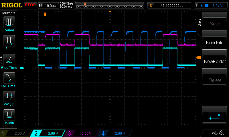 Szerintem a probléma a DDC vonallal lesz, rámértem szkóppal és a mellékletben látható képet kaptam. Az SCL vonal szerintem jó, az az ábrán a sötétkék (CH4) ez a MOSFET előtt is és után is ugyan az a jelalak, ezért erről külön képet nem csináltam.