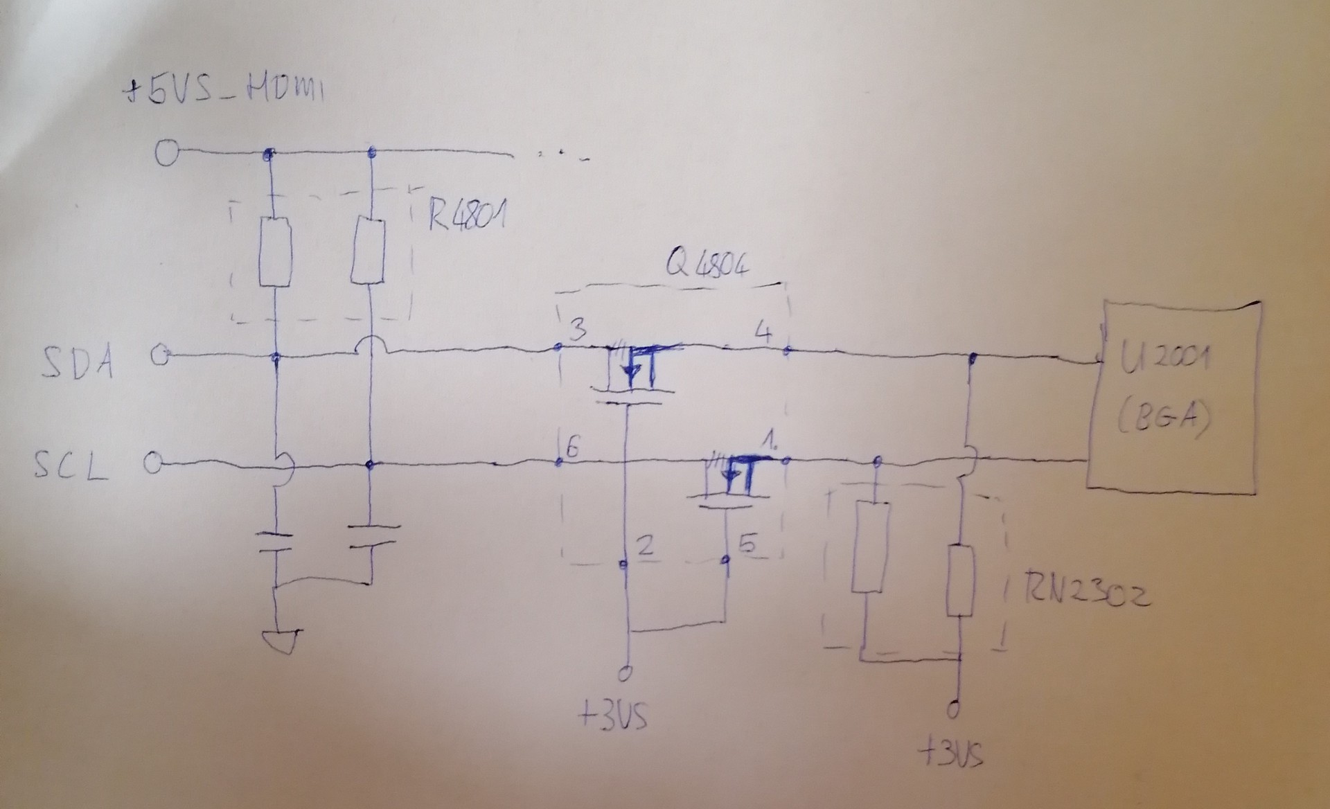 Az SDA viszont, mint a képen látszik a MOSFET 4-es lábán (CH2, türkiz) 0,36V és 2,8V között mozog, viszont a MOSFET 3-as lábán (CH3, lila) 3,3V és 4,68V között mozog. Olyan mint ha a MOSFET lineáris üzemben dolgozna, viszonylag nagy ellenállásként viselkedve. A gate lábán megkapja a 3,3V-ot mind az SDA, mind az SCL vonala. Szerintem ki kéne cserélni a mosfetet, vagy csak rövidre zárni és akkor megjavulna. Szerintetek?