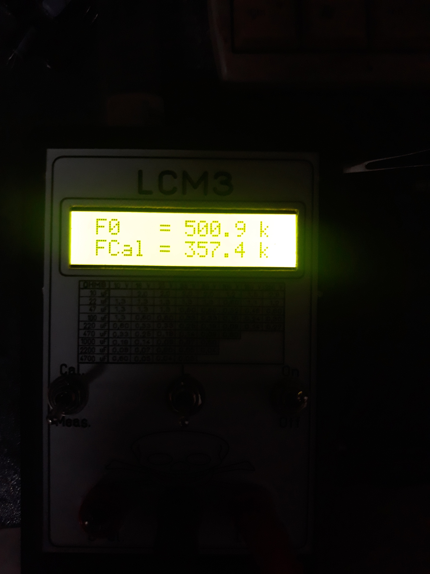 Egy kapcsolás módosításához beszereztem két kondenzátort. LCM3-al mértem, és a képen látható eredményekkel. Minden típusnál az első adat az elektrolit kondenzátorok mérőpontjára csatlakoztatva. A második a normál kondenzátorok mérőpontjára. Ezek a kondenzátorok NEM elektrolit kondenzátorok!
