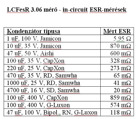 Néhány ESR-táblázattal találkoztam a Neten, de szerintem mindenki a saját használatára a sajátját elkészíti. Így készítettem én is egy kis ESR táblázatot magamnak. A méréseket LCFesR 3.05 mérővel végeztem el. Itt mellékelem. Akit érdekel, megnézheti, összehasonlíthatja a saját méréseivel. Aki szeretne visszajelezni, azt is szívesen venném.
