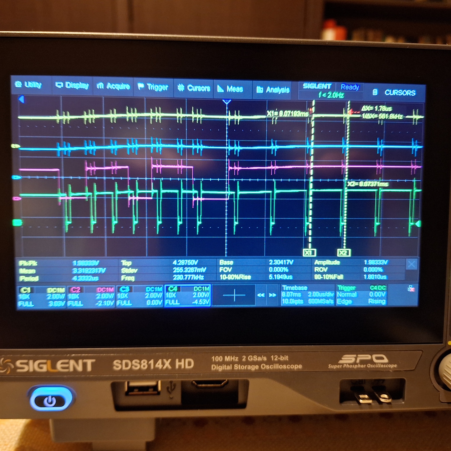 Ránéztem oszcilloszkóppal néhány jelre. Felülről a harmadik RS. Legalsó WR. Kurzor 1,78us.