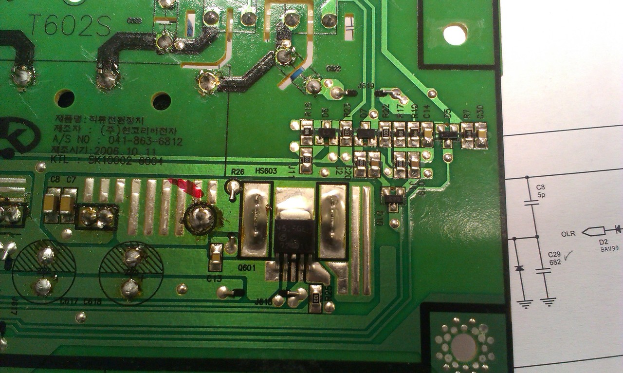 Hibásként vettem. Nem volt javítva elöttem, gyáriak voltak a forrasztások. Úgy hiányzik róla, hogy pl a vezérlő ic valamely kivezetése ami a rajz szerint megy valahová, pl OUTD, az csak le van forrasztva, így az egész ág, ami a rajzon rá csatlakozik hiányzik. Bocs, ha nem voltam egyértelmű, a hiányt úgy értettem, hogy gyárilag nincs rajta minden, ami a service manualban szerepel. Sőt jelölés eltérések is vannak.