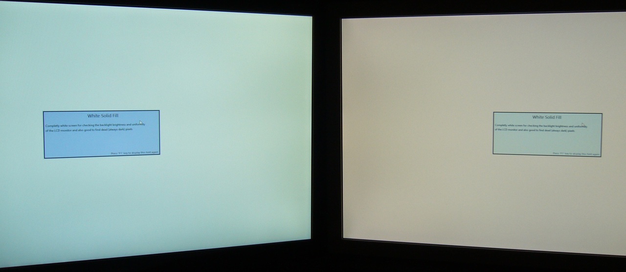 A fénykép természetesen nem adja vissza rendesen a valóságot, de jobb oldali monitoron a fehér már világos sárga és eléggé zavaró. Max fényerőn sötét szobában egyáltalán nem zavaró a fényereje. Új korában még nappal is bántotta a szememet ha maxon volt.