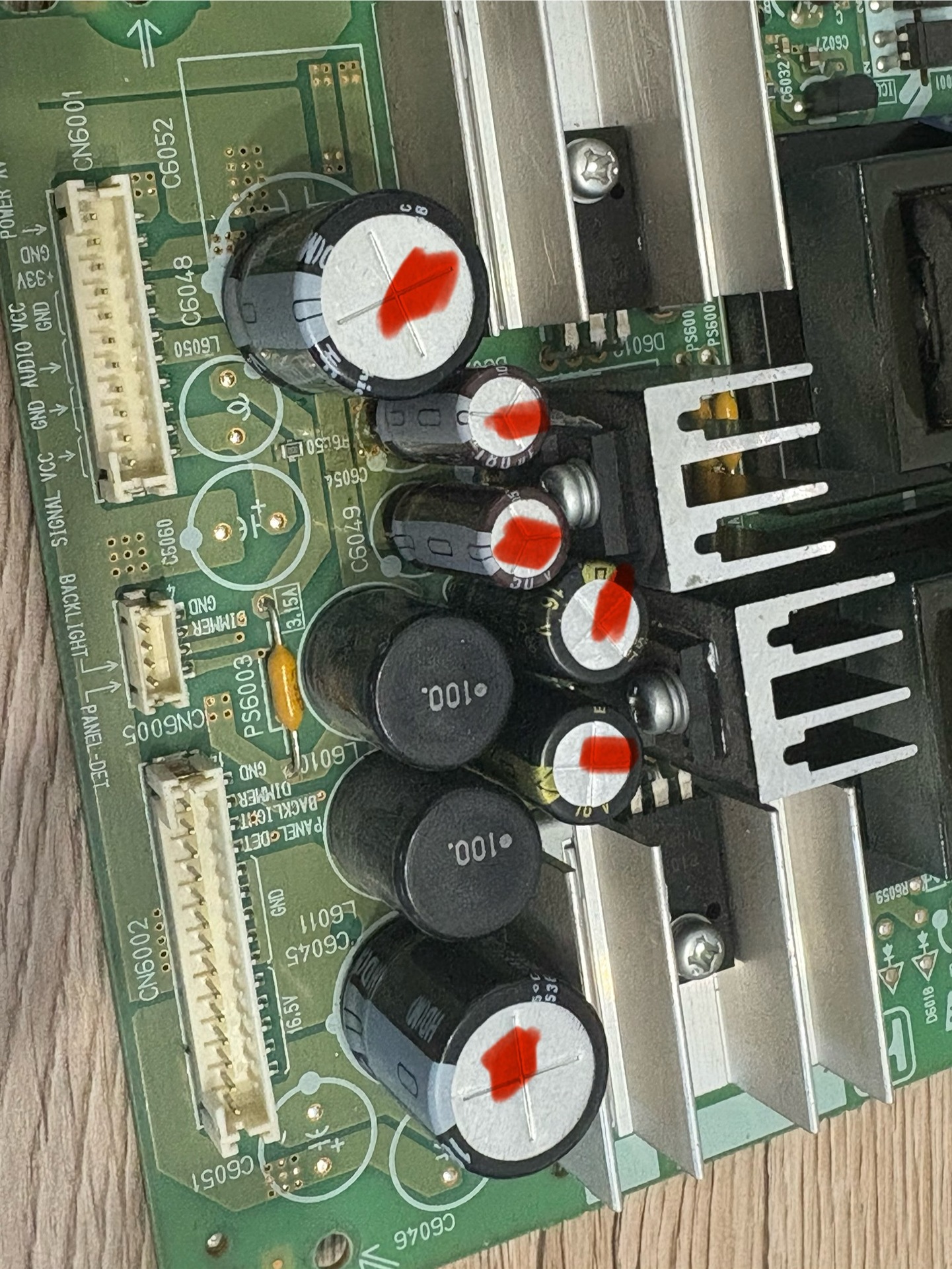 A panel többi összes elektrolit kondiját cseréltem kivéve ezt a 6 darabot. + azt a 2 nagy darab 450 voltos kondit. Azok gondolom sose szoktak eltávozni. Vagy rosszul tudom? Teszteltem most,ês ugyanaz piros led majd bekapcs után nem éled fel.