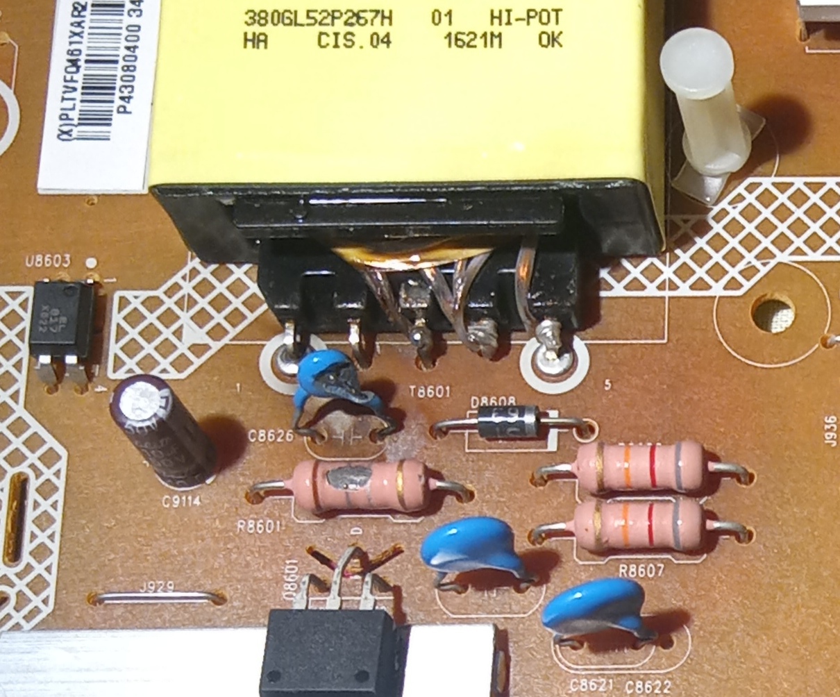 Segítséget szeretnék kérni Philips 43PUS6101/12 -es lcd tv javításában. A hiba jelenség: ma délután bekapcsolás után kb. 1 perc múlva csattanó hangot adott, és kikapcsolt. Közelebbről megvizsgálva a tápegység panelon 1 db kondi (C8626 jelzésü) levetkőzött, meg az alatta levő (R8601 számú) ellenálló is megmutatta az alsóneműjét. A kondin felirat nincs fogalmam sincs milyen értéket képviselt mielőtt kijött belőle a működtető füst. Az ellenállás kicsit jobban néz ki, barna, szürke, ezüst, arany csíkok vannak rajta, amit 0,18Ohm -nak tippelek, egyik lábát kiforrasztva 60MOhm-os méréshatárnál szakadást mérek. Jobbra tőlük D8608-al jelölt dióda, ránézésre semmi baja, kiforrasztva, dióda vizsgálóval szakadás mindkét irányban. (ARS163, van ráírva, google semmit nem dobott). Hogy őszinte legyek ötletem sincs hogyan tovább. Legyetek szívesek adjatok ötleteket, előre is köszönöm.