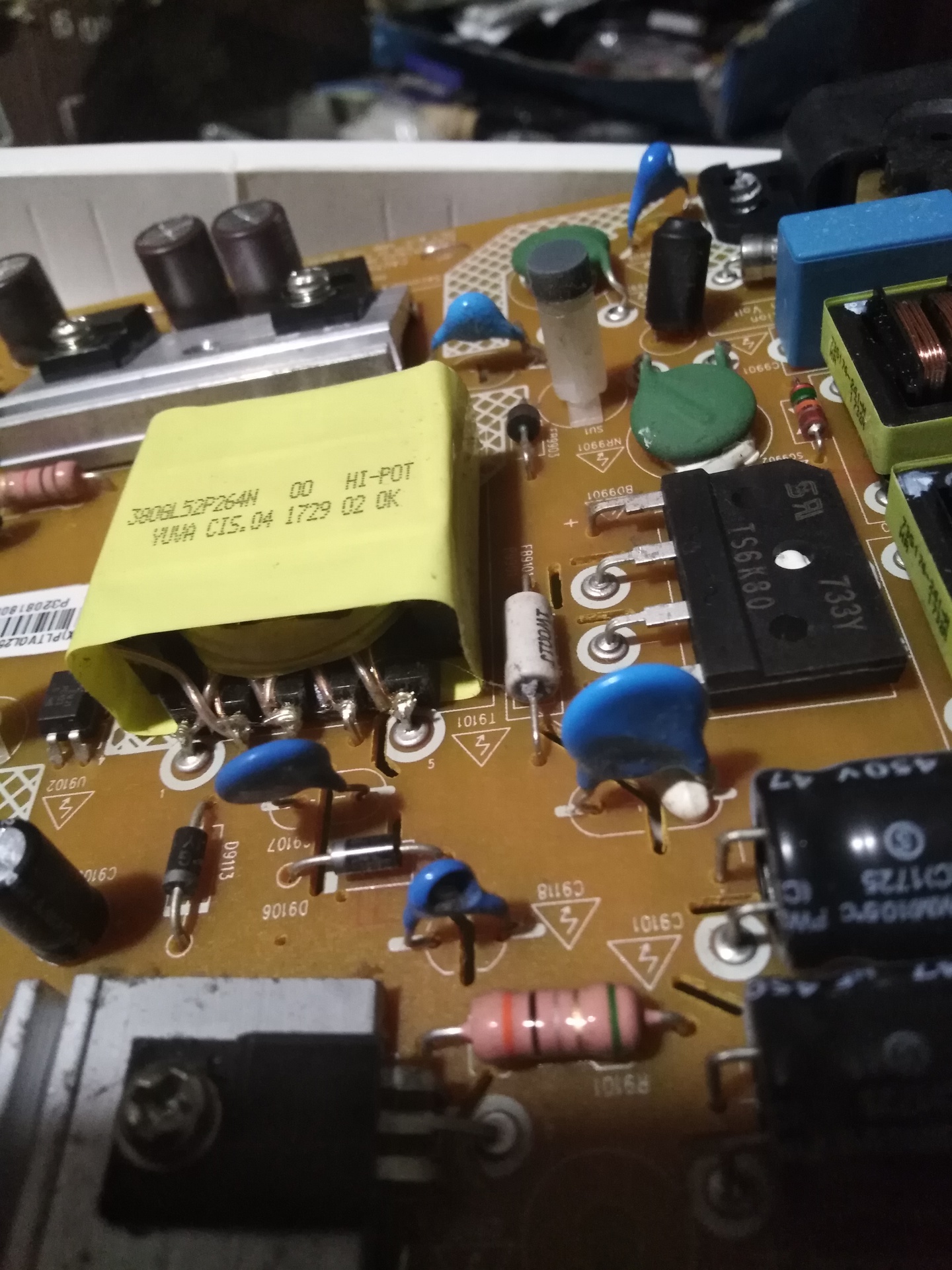 Kondiból 2 vagy 5kV amit szokás rakni, nagyobbat felesleges. A fehér fusible resistor is elszáll. Illetve mint kiderült, ennél a típusnál előfordul az ic megússza es csak a zener, kondi és 0.1r megy ki. Zenert úgy mérd, hogy a fet melletti rózsaszín source ellenállást kiemeled. Meg a fetet is mérd ki azért.