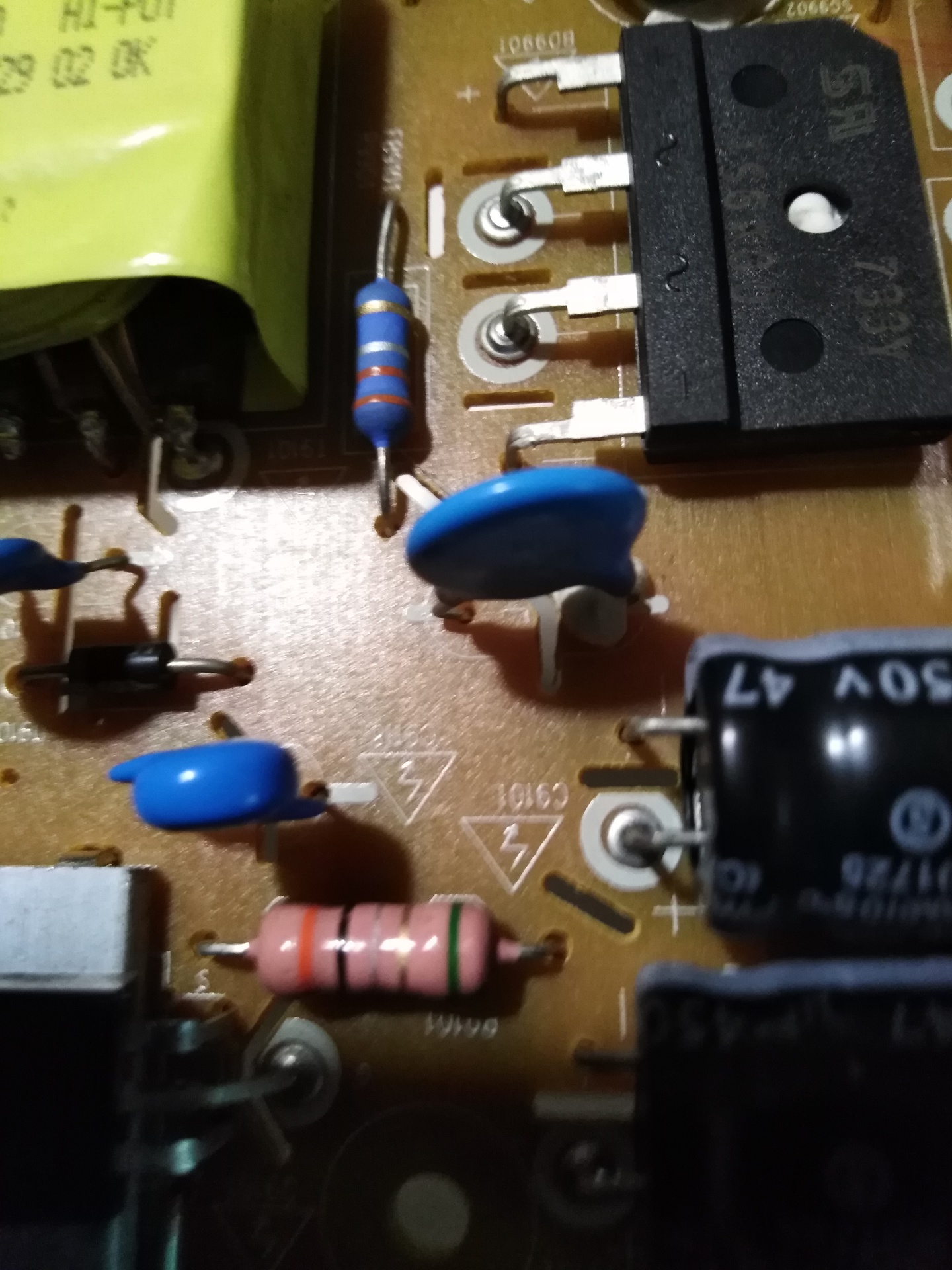 A 100pF 1kV kipukkadt helyére 100pF 10kV lett betéve. Az 5,1V Zéner helyére ( zárlatos volt ) ZPD 5,1 . A 0,1ohm/1W helyére 0,33 ohm 1W fémréteg ellenállás. Utólag kimérve ez a fusibe resistor jó lehet. Most így be sem kapcsol, a korábbi jelenség, LG logó 3-4 másodpercig, kikapcsol, újraindul nincs meg. Lehetséges, hogy a 0,1 ohmos resistor cseréje, vissza tétele megoldaná a problémát ?