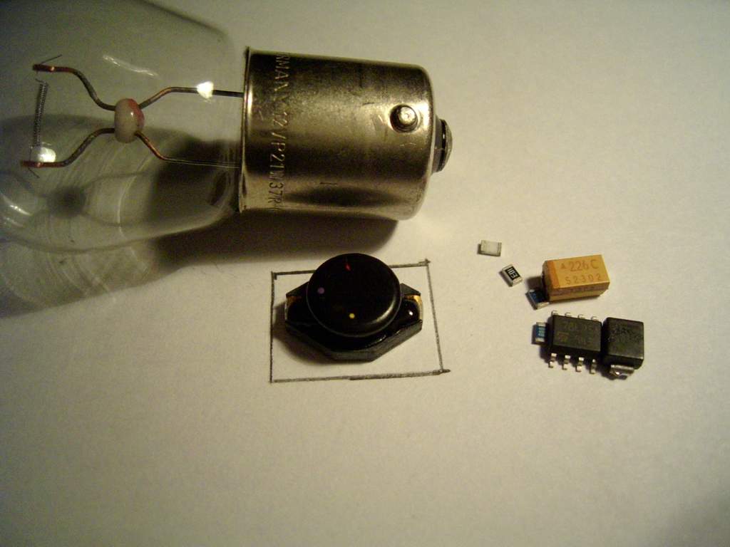 Jövőhéten építek egy 1W-ost és egy 3W-ost. Lefotózom izzó mellet és meglátjuk mi az eredmény. Frankye-nek igaza volt, akkora hely van ebbe a foglalatba, hogy féligmeddig hagyományos alkatrészekkel próba nyákon is kulturáltan megvalósítható az áramkör!