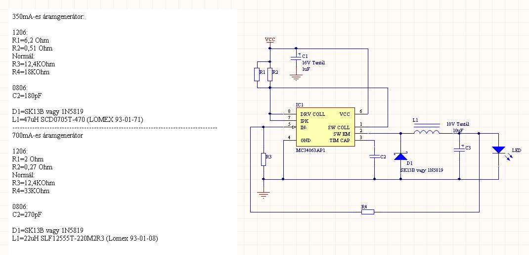 A végére csak letisztul, hogy is van ez a kandellawattoslumen! Elkészítettem a kapcsrajzot. Igyekeztem a Lomex kínálatából választani. Még nem raktam össze, de holnap meg lesz az is. Két változat van: egy 350mA-es az 1W-os LED-hez és egy 700mA-es a 3W-oshoz. Scatman: Azt mondod 2x3W elég lesz a féknek-> akkor rágyúrok a 2x3Wos soros kapcsolású áramgenerátorra is! Melékelem még a nyák elrendezést, és egy demo változatot (nem működőképes, csak szemléltetés!) Jöhetnek az észrevételek és javaslatok!!