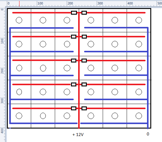 Inkább valahogy így rajzolnám. Természetesen lehet úgy is kötni, hogy a 3. Led-ek alja (katódja) megy a negatívra és az ellenállás a +12V-ról jön az első tetejére (anódjára). Csak ezen a rajzon így egyszerűbb volt lerajzolnom. Az ellenállás attól függ, mekkora aksi feszültséggel számolunk. Ha 12V-al, akkor 180ohm-al csak 13mA lesz egy oszlop árama. Ha ez elegendő... üdv! proli007