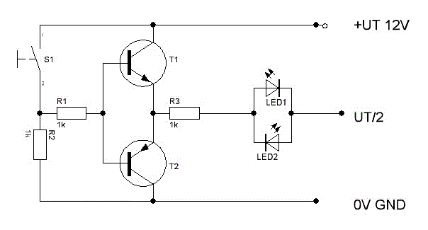 Összesen két állapota van. A nyomógomb elengedett állapotában az egyik LED világít, a zárt állapotban a másik. A tranzisztorok közös pontja vagy 0V vagy 12V. A féltáphoz képest + vagy - 6V Üdv: Gábor