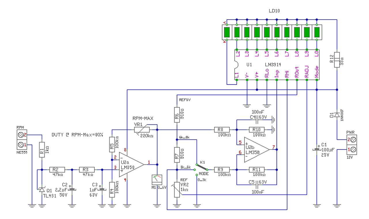 Az 555 gondolom a monostabil kimenete lesz. Annak időzítését úgy kell beállítani, hogy maximális fordulatszámon a jel kitöltése 80% körül legyen. - A TL431 formálja a jelet. 100% kitöltésnél 2,5V feszültséget adna, 80% mellett 2V lesz a kimenti jele. Az első OPA ezt felerősíti úgy, hogy maximális fordulaton, az M1 mérőponton 6V feszültség legyen mérhető. Tehát itt 0..9000f/min esetén 0..6V lesz. Ezt lehet beállítani a VR1-el. - Az R2/C2 R3/C3 fogja átlagolni (integrálni) a fordulattal arányos impulzusokat. Így ezek után már egyenfeszültség lesz. - Az LM3914 referencia feszültségét a VR2-vel 6V-ra állítod be. A második OPA kivonó kapcsolás. 0/2/4V-ot fog levonni a kapcsoló állásától függően. Ez kerül az LM3914 bemenetére. Így lesz a méréshatár állítható az általad kívánt tartományokba. A hozzászólás módosítva: Máj 30, 2017