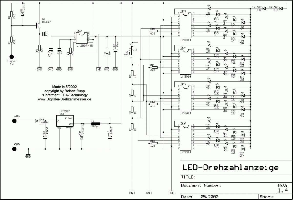 Ledes fordulatszámmérő építésén gondolkodok. 0 - 7000/min tartományra van jelölve a gyári fordulatszámmérő, 6000-ig 250-es osztásokkal, felette 200-assal. A mellékelt kapcsolást szeretném megépíteni, 28 leddel, a jelet a gyári fordulatszám jeladóról venném le. Kell valamelyik alkatrész értékén változtatnom vagy maradhat minden a rajz szerint? |