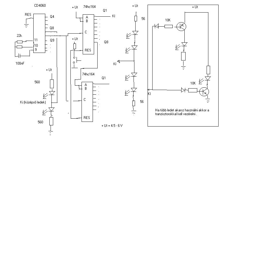 Ha több ledet használsz ,és azt akarod hogy pontosan számoljon 4,8,16 leddel akkor a 4060 magasabb (Q10,Q11) kimenetét kell használni a shiftregiszterhez. Ha túl gyors/lassú a 4060 9,10,11 lábára menő alkatrészekkel tudod változtatni. A 74HC164 ic-ből annyit köthetsz sorba amennyit akarsz,illetve kevesebb kimenetét is használhatod mint 8. (igény/pénztálca/lustaság) A ledek elhelyezése: ami a pozitív felé megy az kerül a felső tányérba. (felül a felső ic Q1...8.. alsó ic Q1...8 ) lejjebb). a negatív fele menők az alsóba .(fordítva)