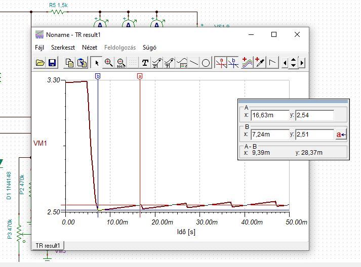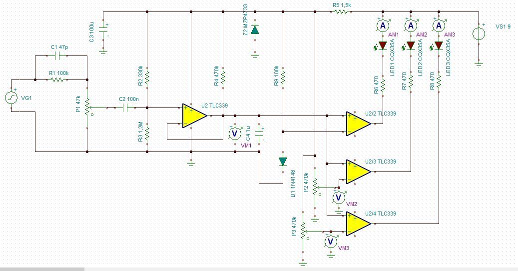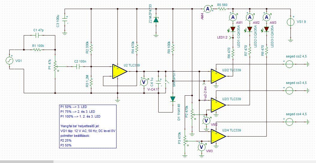 - R5 ellenállását 560 Ohm-ra csökkentettem, hogy R5 árama elérje a ~8mA-t - C4 rövidzárására betettem a szimulációba egy vezetéket kapcsolóval, megnéztem, hogy így mind a 3 LED világít-e. Először nem világítottak, majd ahogy javasoltad, a komparátorok kaptak tápot, 4,5V-ot, amennyi a zéner ágán mérhető; (9V-5,1V)/0,560k = ~ 7 mA. A szimuláció 8 mA-t mutat. - VG1-et 12V AC 50Hz 0V DC level értékre válsztottam, hogy egy kistranszformátorral is tesztelni lehessen. Így a P1 potméterrel lehet állítani C4 feszültségét, így az előzetesen a P2 és P3 trimmerrel beállított komparátor invertáló láb-GND feszültségek mérvadóak abból a szempontból, hogy a P1-el beállított C4 feszültség melyik komparátor leosztott referencia feszültsége az invertáló lábon, amely magasabb C4 feszültségénél, így bebillenti azt a komparátort, ami az adott LED-et kapcsolja. - tehát a P1 állítgatásával lehet a ledeket kapcsolni. Gondolom gyakorlatiasabb, ha a VG1 AC feszültségét állítgatom, mert a hangszóró kapcsain is ez történik. De ezt hangszóró megcsapolásával érhetem el, mert ugye változtatható váltakozó feszültségű tápom nincs ( és jelgenerátorom sem). - annyi kérdésem még lenne, hogy U2/2 invertáló láb-GND feszültségét mivel lehet változtatni? R9 változtatásával? köszönöm, ez így már nagy segítség, remélhetőleg lassan össze is tudom rakni próbapanelena kapcsolást. Gondolom egy a rendelkezésemre álló hangszóró kimenetének kapcsain meg kellene mérjem a feszültséget, hogy lássam az értékeit, hogy azzal működik-e