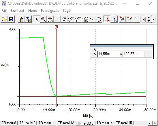 - A zéneren azért van 4,7V, mert az R5 ellenállása túl sok. R5 árama = (9V-5,1V)/1,5k=2,6mA. Egy komparátor tápárama 0,8..2mA az adatlap szerint. És mivel ebből 4 is van, a tápáram meg 3,2..8mA között is lehetne. Pesszimista tervezés szerint az R5 áramát 8mA-ra kellene választani. - Ha a bemeneti jeltől a C4 feszültsége 3,3V-ról 2,5V-ra jön le, akkor annak a komparátornak kellene bebillenve lenni, aminek a leosztott referencia feszültsége az invertáló lábon, ennél magasabb. - "VG1-et állítom -1V-okkal lefelé 10V-ról" Ha ez DC feszültséget jelent, akkor nem csoda, hogy nem csinál semmit. Mert ott a VG1-en váltót kell állítgatni. Ha pedig azt állítottad, akkor azt a C4 feszültségén lehet megfigyelni de csak a tranziens szimulációban. - Próbára, ha a C4-et rövidrezárod (valóságban is megtehető), akkor minden Led-nek világítania kellene. Ha ez nem teljesül, akkor próbálj meg, minden komparátornak 5,1V és GND tápot adni. Egyébként a Led katódokon értelmetlen lenne a 100mV feszültségnek lenni, hiszen a diódák, a 9V-ról "lógnak lefelé" és nyitóirányban vannak. Majd alakul ez, mint púpos gyerek a prés alatt.. A hozzászólás módosítva: Kedd, 20:37
