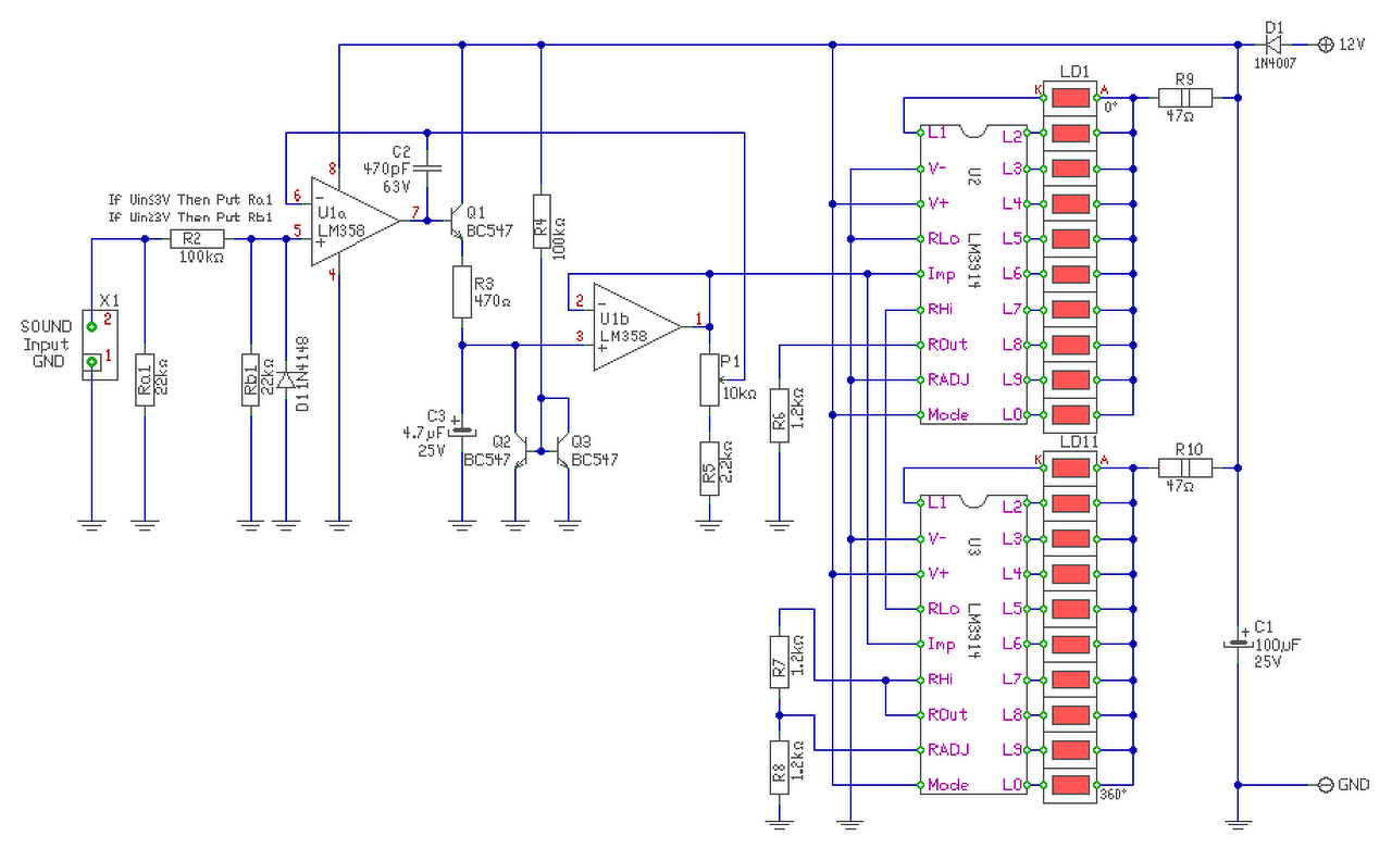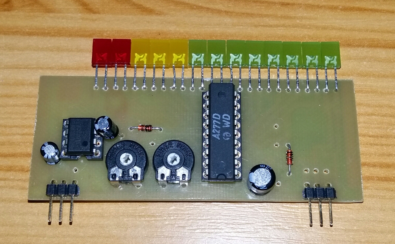 Tehát így működik "zöld-zöld és piros- piros". Tekintve, hogy a zöld és piros együtt is világít, két meghajtó LM3915-öt kell használni egy időben. Egyet a zöldeknek, egyet a pirosaknak. A színenként közösített anódokat kell kapcsolni PNP tranyóval.