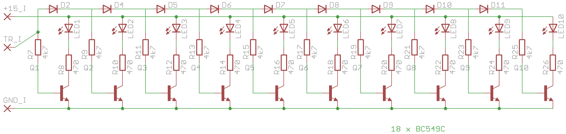 10 db 2,2 k ohm -os ellenállás (jó kicsi méretű), 2db 47k ohm -os ellenállás, 2db 10k ohm -os ellenállás, 2db 47 µF-os elektrolit kondenzátor, 2db 4,7µF-os elektrolit kondenzátor. 6db zöld LED, 2db sarga LED, 2db piros LED. 1db TA7666 IC. De ezt Te is össze bírod írni egy kapcsolási rajz alapján.