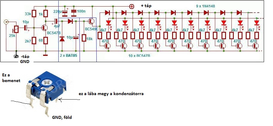 Sorban: - biztos működik, elég alapkapcsolás - igen, az a jel bemenetét mutatja (jack vagy 2db RCA csatlakozó) - az összes kondi elektrolit a képen (a + jelből valószínűsíthető legegyszerűbben) De, remélem tudod, hogy ez NEM 20LED-es VU-meter! Illetve az, de 2 LED mindig egyszerre fog világítani. Magyarul, ez egy sima 10 LED-es kivezérlésjelző, ahol minden LED-et megdupláztak.