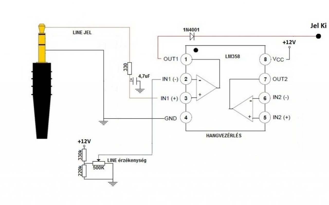 Van benne mély hangokra szűrés, mert a 300ohm/4,7µF egy alul-áteresztő szűrőt alkot, ami kb. 100Hz felett már csökkenti a bementi jelet. (Egyébként ha a bemenet nincs rákötve "semmire", vagy is szakadtnak tekinthető a bement, az IC bementi árama miatt a kimenete magas szinten fog állni..)