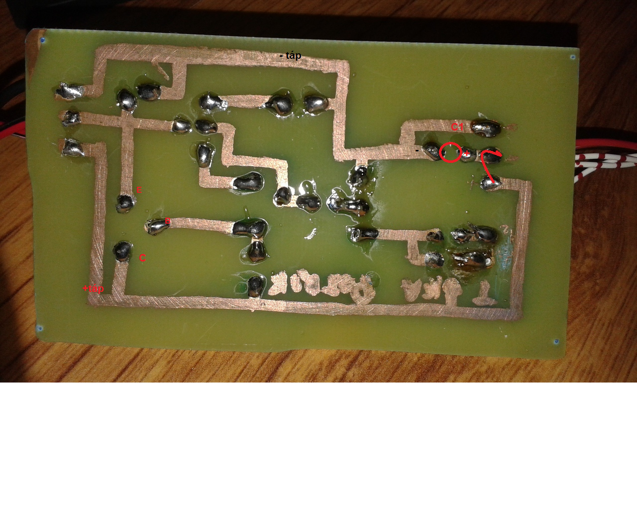 Ezt javaslom: pirossal az átkötés a C1-nél. A kritikusabb a tranzisztorok helyes bekötése, a Q2-nél beleírtam pirossal