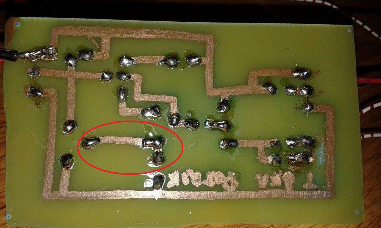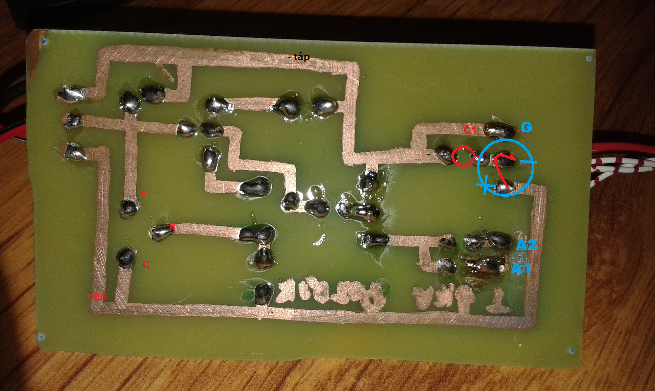 Ha megnézed a rajzot akkor Q1 C és Q2 B össze van kötve egymással (pirossal bekarikáztam). Idézet: „ Ja és a Q1: E:0 B: 12 C: 12 Q2: E:0 B: 0 C: 12” Vagy nem jól mértél, vagy nem jó helyen mérted, vagy szakadt ez a vezetősáv (bár a fotón nem annak látszik). A piros körben lévő 3 forrponton a negatív tápfeszültséghez képest mindenhol azonos feszültség értéket kellene mérni. Ha ez nem így van akkor szakadt a vezetősáv. Ha egyeznek a feszültségek akkor kérlek írd meg, hogy mennyit mértél ! Lehet, hogy egyik vagy mindkét tranzisztorból akár új is kellhet (nem bírták a fordított bekötést). Normális, jól működő áramkör esetében Q2 E-n 0 és 12 közötti feszültséget kellene mérni pl 5V-t.